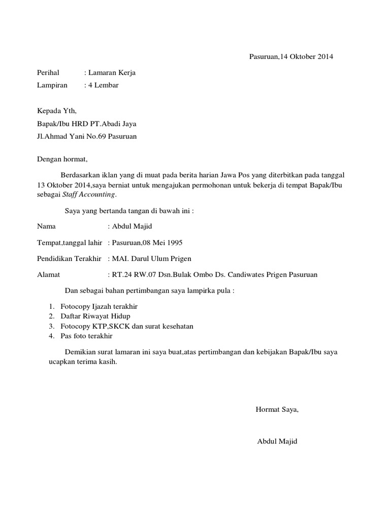 Savesave surat lamaran(semi block style).pdf for later. Dan berikut kami akan memberikan contoh surat lamaran kerja lengkap. Contoh surat lamaran kerja yang berformat doc dan juga pdf bisa dikirimkan lewat email seperti surat lamaran kerja guru, bank ataupun bahasa surat lamaran kerja ini tidaklah sama seperti cv. Kepada yth, bapak/ibu hrd pt.abadi jaya jl.ahmad yani no.69 pasuruan. Di atas adalah penerapan surat model full block style dalam bahasa inggris yang bisa kita contoh dengan susunan atau struktur mulai dari kop surat tanggal nomor perihal dan juga isi surat hingga salam penutup.